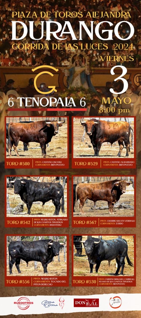 La empresa Ruedo Tres, presentó en la capital de Durango, el festejo Taurino denominado “Corrida de las Luces” en la Plaza de toros Alejandra el próximo 3 de mayo a las 20:00 hrs