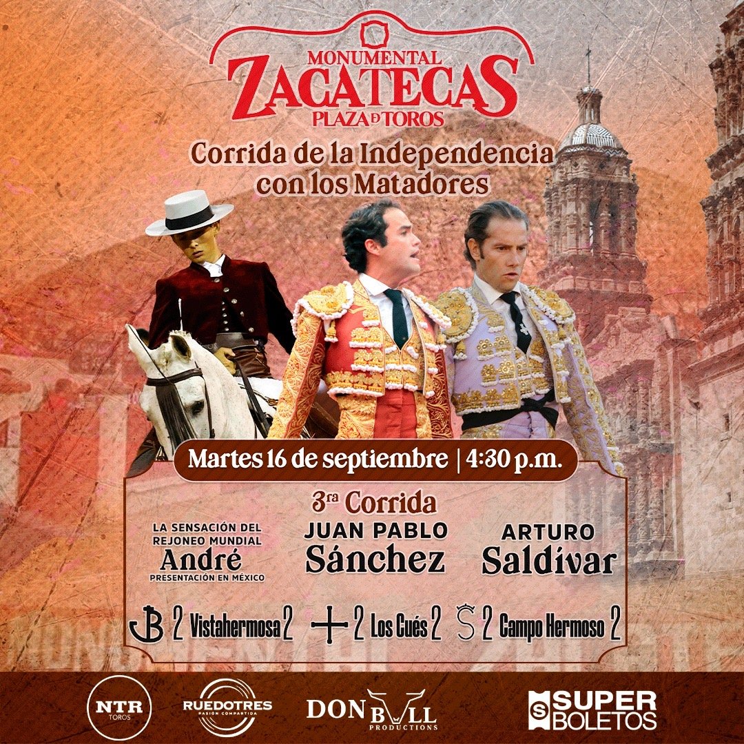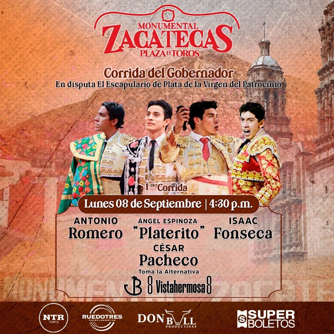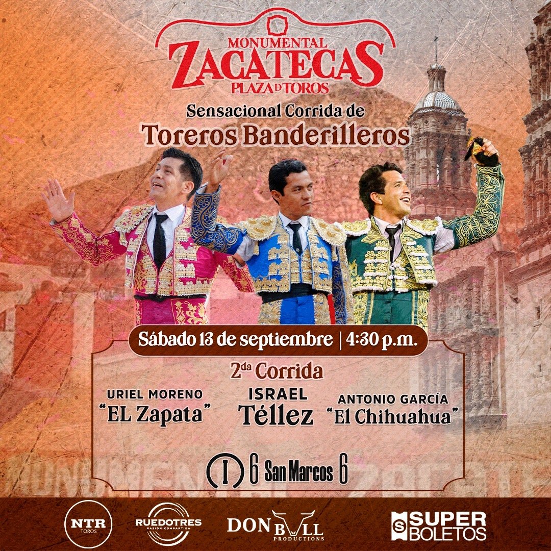 ZACATECAS. México.- A nombre de la empresa Don Bull Productions, el matador Manolo Mejía dio a conocer los carteles para las tres corridas de toros que se llevarán a cabo durante el mes de septiembre en la plaza de toros Monumental Zacatecas.