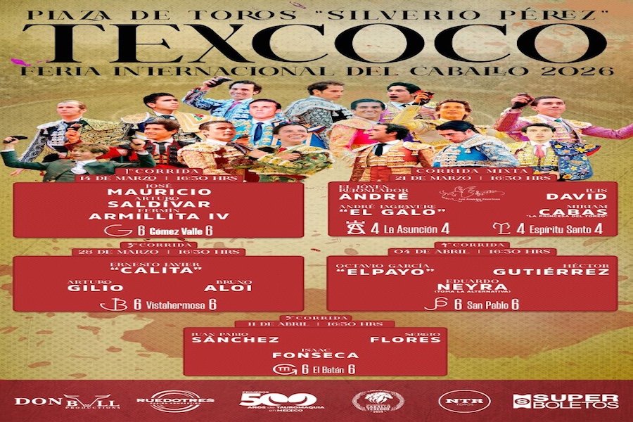 A nombre de la empresa Don Bull Productions, el matador Manolo Mejía dio a conocer las combinaciones para los cinco carteles taurinos que se llevarán a cabo en la plaza Silverio Pérez de Texcoco, Edomex., en el marco de la Feria Internacional del Caballo 2026.