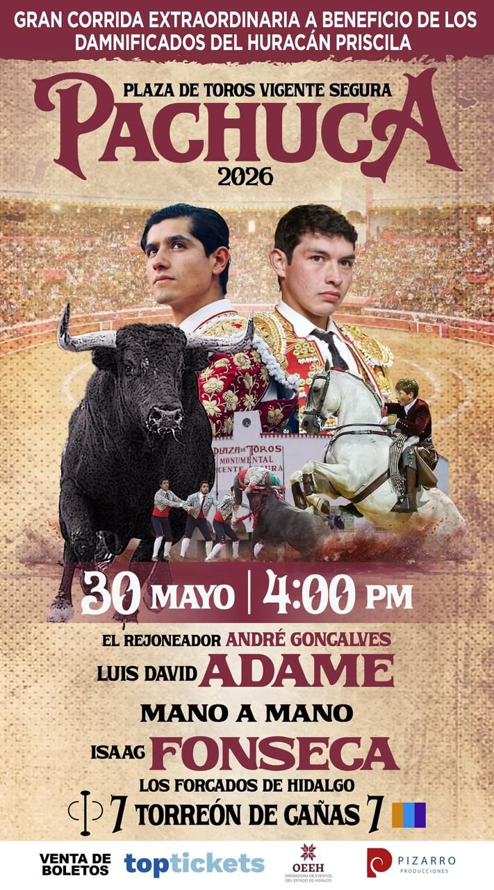 En el ruedo de la Plaza de toros Vicente Segura de Pachuca, Hidalgo, se llevó a cabo la presentación del cartel que se llevará a cabo el próximo 30 de mayo a las 4 de la tarde: con el rejoneador André, los matadores Luís David e Isaac Fonseca y los Forcados de Hidalgo, quienes lidiarán un encierro de Torreón de Cañas.